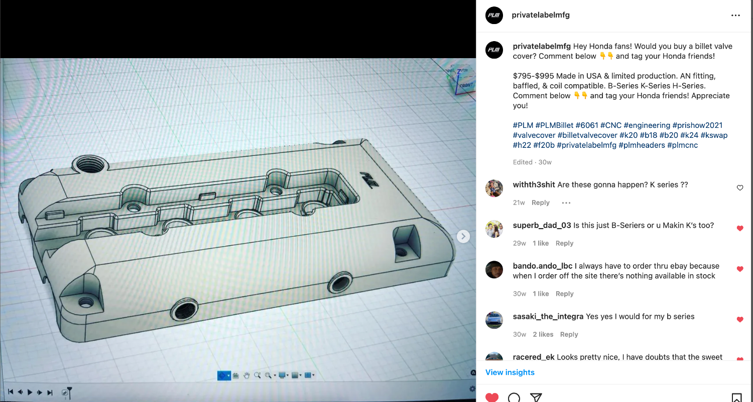 In stock and limited—order today! The PLM Billet Valve Cover for Honda B-Series engines (B18, B20, B16) is here, made possible by overwhelming feedback from our Instagram followers. After months of meticulous design and programming, our prototype is nearly ready for test fitment. Follow us on social media @PrivateLabelMfg for updates! Starting with a precise scan of the OEM cover, we achieved measurements accurate to 0.005", then redesigned it with a baffle system and optional dual AN10 ports for easy installation of an oil catch can or air-oil separator. We also included an integrated circular cut-out design, allowing cam timing adjustments without removing the cover. Buy the original PLM for the best in quality and design!
